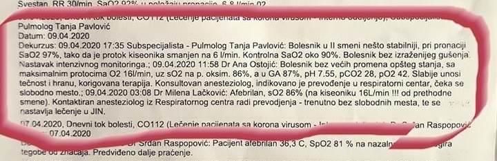 Đurić je na Fejsbuku, uz izveštaj iz Zemunske bolnice, Vučiću odgovorio da je njegov pokojni otac tri dana čekao na red za respirator.